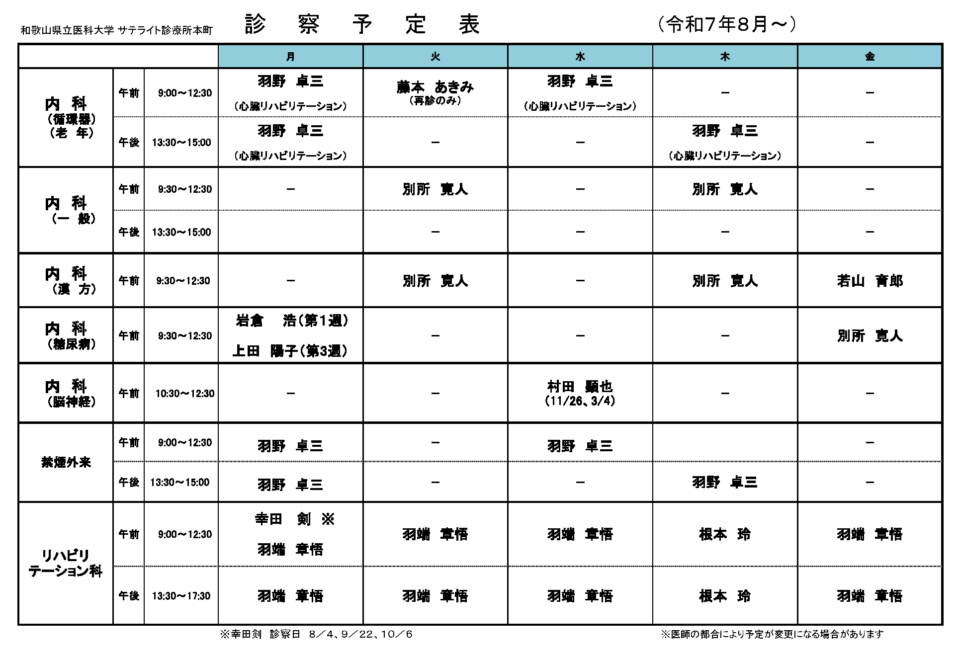 ※診察予定が急遽、変更になる場合がありますので、電話等で予めお問い合わせ願います。